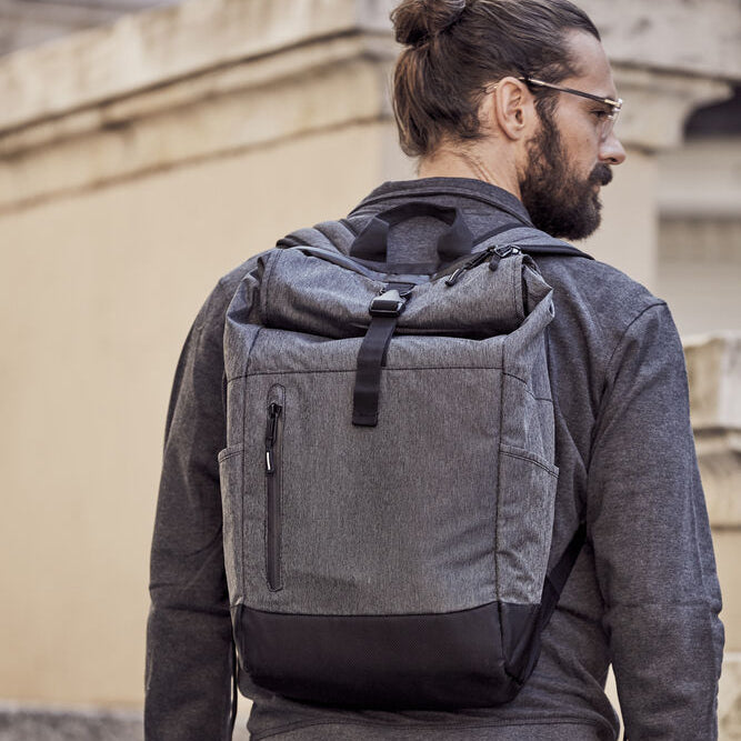 Moderne ryggsekk med "roll up" funksjon for å øke volumet ved behov. Separat lomme til 15" pc. Sikkerhetslomme bak og skjult lomme i bunnen. To lommer på siden. TPU glidelås, reflekterende zip pullers og innvendig nøkkelkrok.